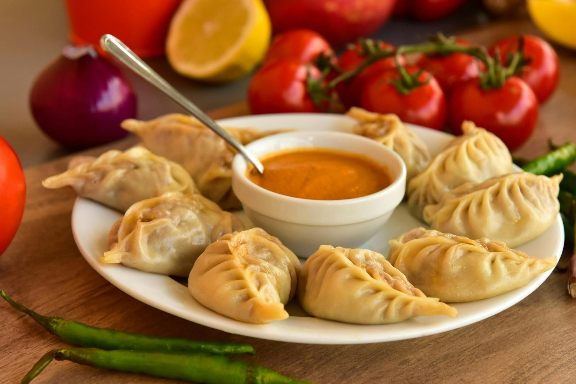 Orientalne pierożki gotowane na parze podawane na gorącej patelni z cebulą, pomidorami, papryką oraz naanem. opakowanie